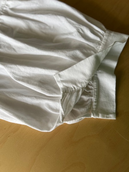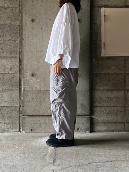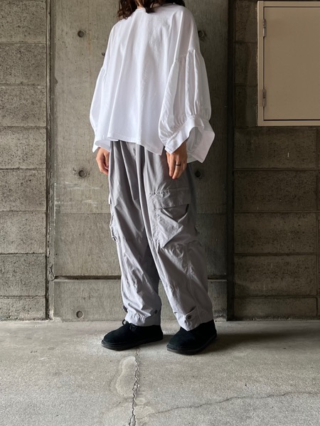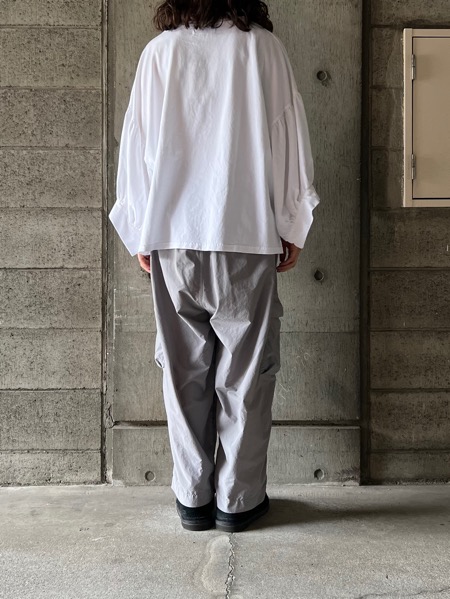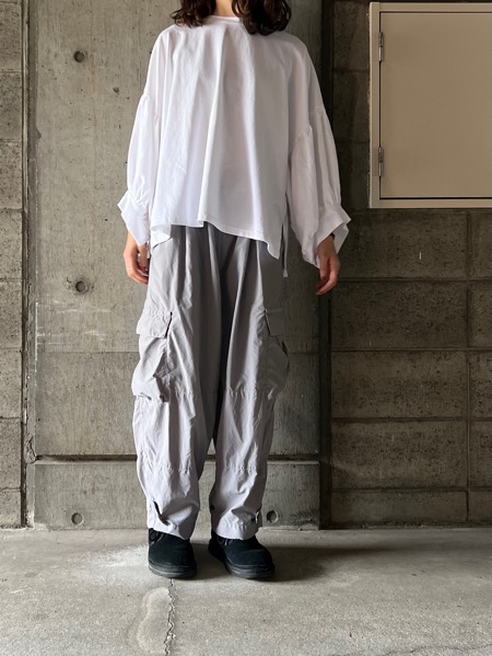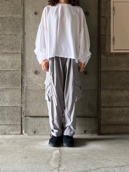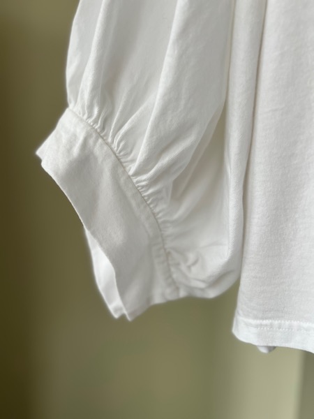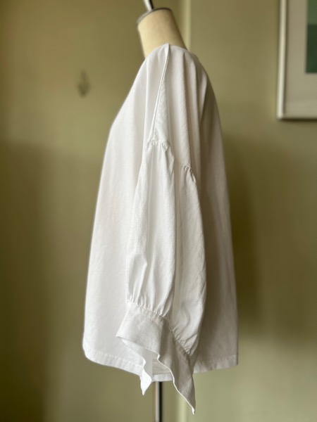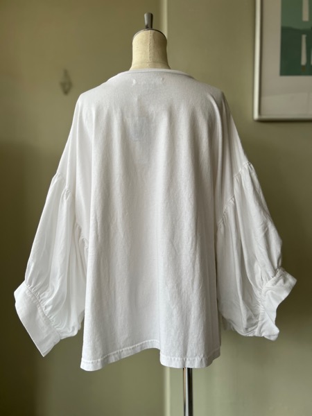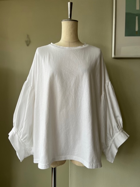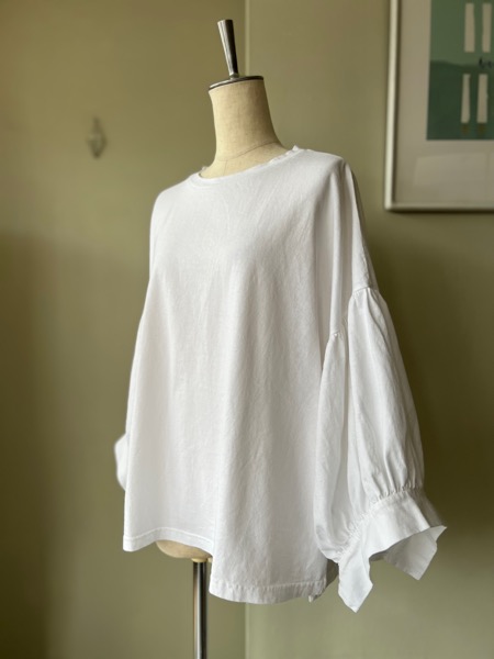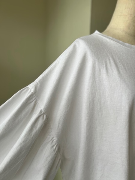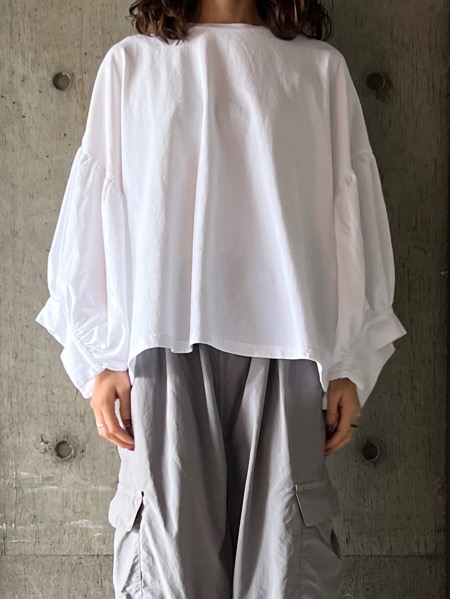 ゆったりと余裕のあるワイドな身頃に付いた、ギャザーをあしらった太い袖が特徴的なデザイン。
