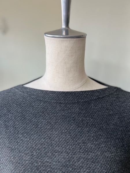 襟ぐりには繊細なリブがはみ出すようについています。