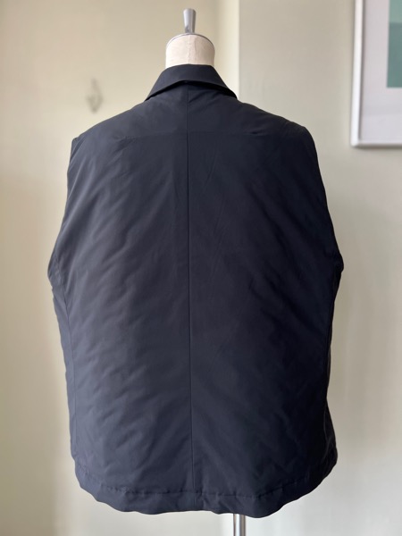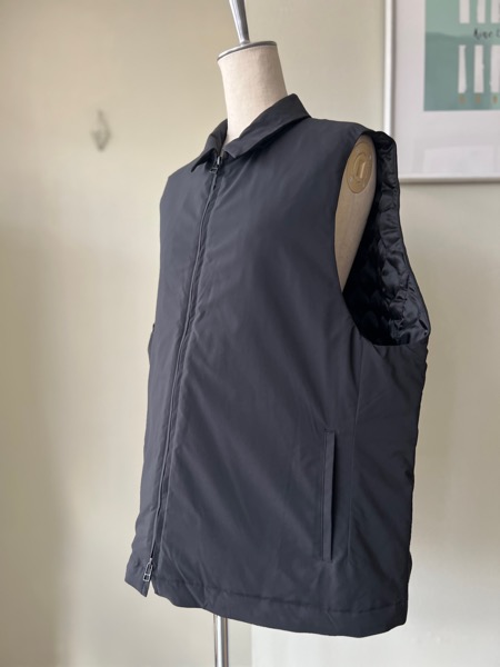 襟のタブを留めるとスタンドカラーにもなるベスト。