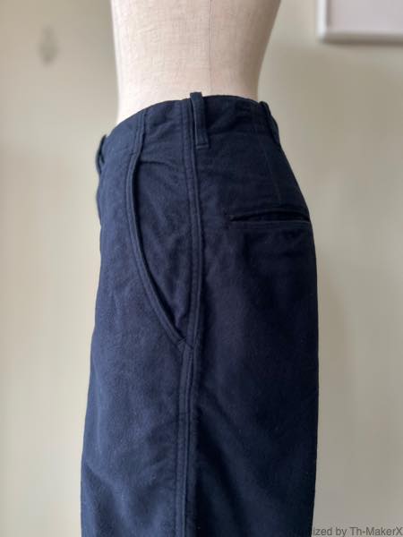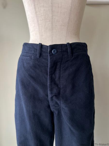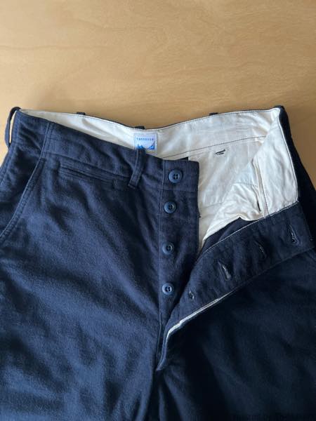 ボタンフライの深めの股上、テーパードしていないストンとした太めのシルエットなど、フランス軍のアーミーチノパンを再現したデザインは、秋冬のスタイリングを小馴れた印象にしてくれます。