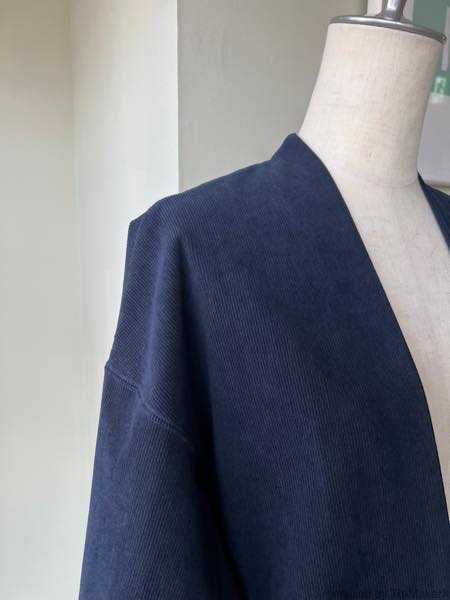 経編みでコーデュロイを表現したポリエステル・トリコット編みニット生地のカーディガンです。