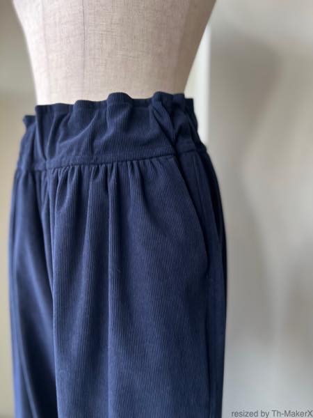 経編みでコーデュロイを表現したポリエステル・トリコット編みニット生地のテーパードパンツです。