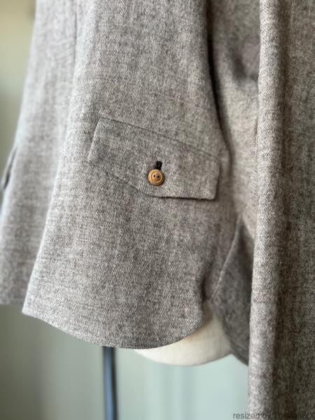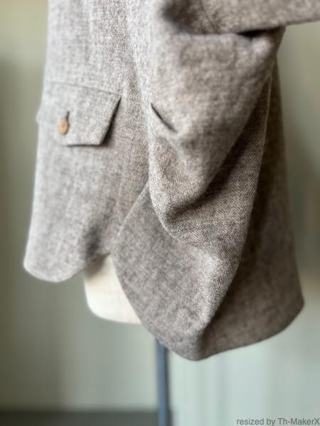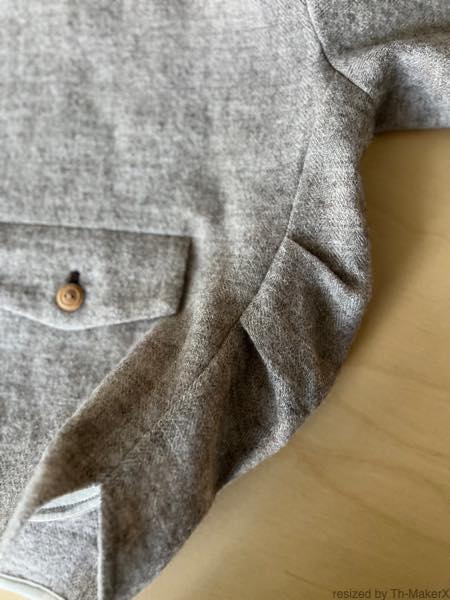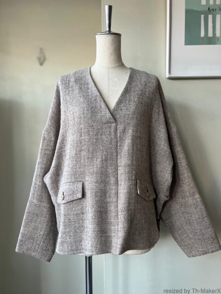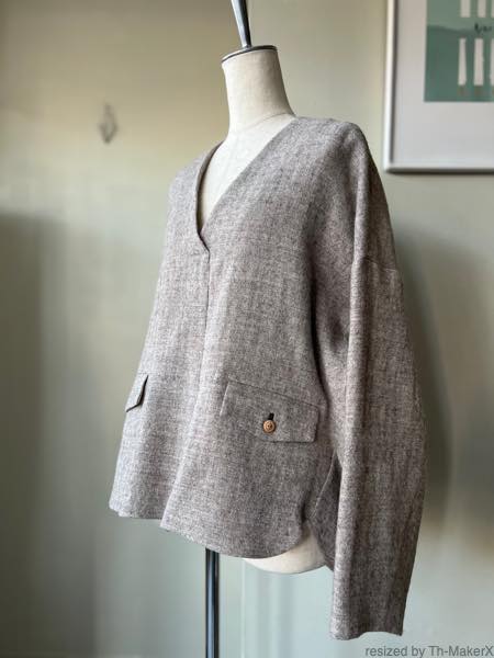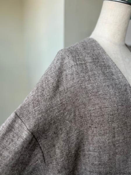 経糸に1/25番手のノルマンディリネン、緯糸に1/14のシェットランドウールの混紡糸を使用した、シェットランドウールリネンのヘリンボーン生地のスモックブラウスです。