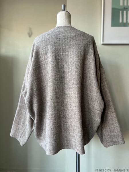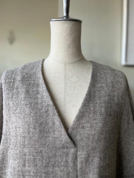 深めのVネックあき、サイドには大きなタックを施し、サイドからバッグにかけてゆったりとした丸みのあるラインに仕上がっています。