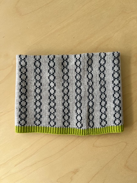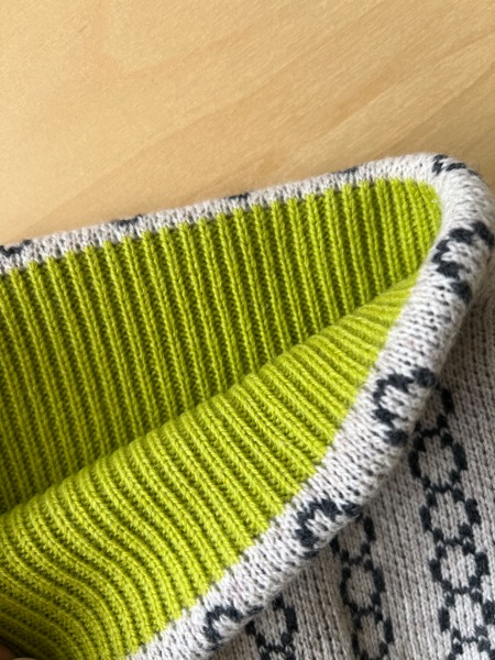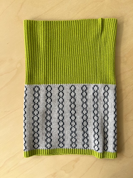リブとジャガードの境目をふたつ折にして、首からかぶる仕様のかわいい防寒アイテム。